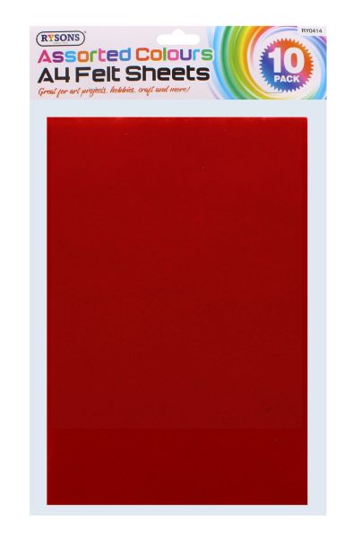 These 10 A4 Assorted Coloured Felt Sheets by Rysons are ideal for art projects, hobbies, craft & more!
