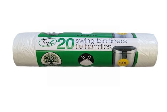 Tidyz Swing Bin Liners with Tie Handles - White - 50 Litres - Pack of 20 - 90 x 120cm