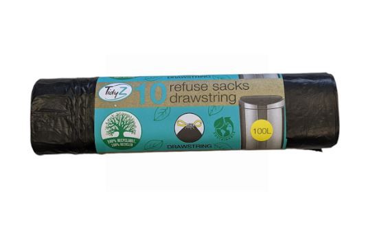 Tidyz Sustainable Drawstring Refuse Sacks - 50L - 124 x 79cm - Black - Roll of 20
