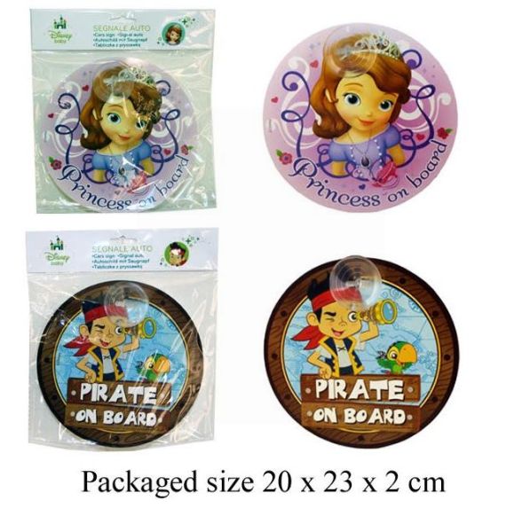 DISNEY BABY PRINCESS/PIRATE ON BOARD CAR SIGNS COMES IN 2 DESIGNS: 1 PINK FOR THE GIRLS, AND THE BLUE FOR THE BOYS DESIGNS AND COLOURS MAY VARY BEAUTIFUL COLOURFUL IMAGES ON THE FRONT OF THE SIGN BOYS CAR SIGN: "PIRATE ON BOARD" GIRLS CAR SIGN: "PRINCESS ON BOARD" SHAPE: ROUND SIZE APPROX: 17.5cm PLASTIC SUCTION CUP ON THE BACK TO SECURE IT ON THE CAR PACKED IN A TRANSPARENT POLY BAG WITH A HEADER HEADER HAS A HOOK FOR BUSINESS RETAIL DISPLAY USE