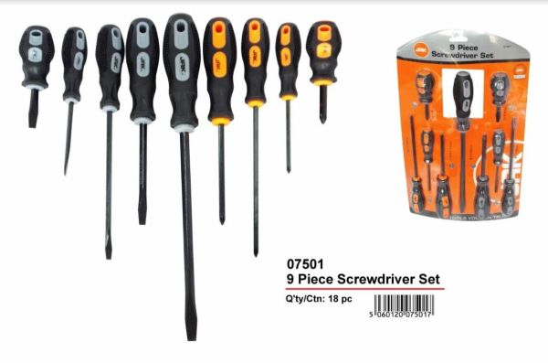 JAK Comfort Grip Screw Driver Set - Pack of 9 - Assorted Colour, Size and Shape