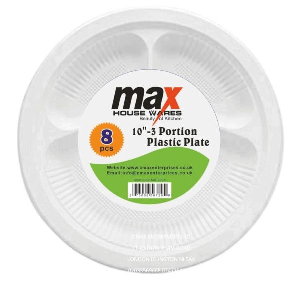 Heavy Duty Plastic Disposable Plate - White - 10" - 3 Compartments - Pack of 8