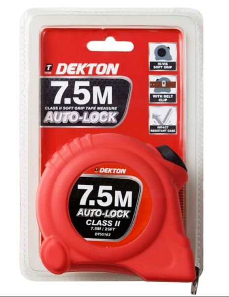 Dekton Class 2 HI-VIS Soft Grip Auto-Lock Tape Measure with Belt Clip - Red - 7.5m