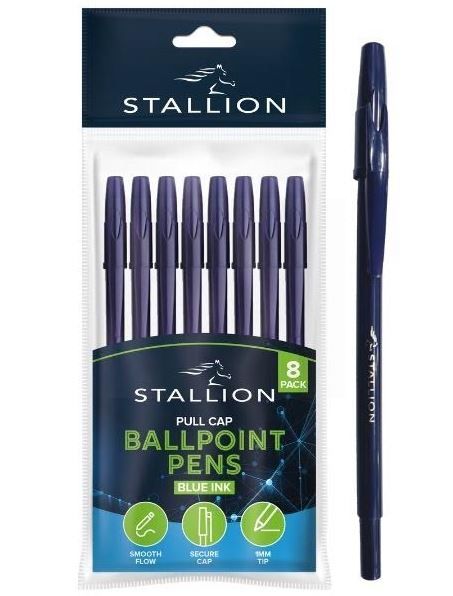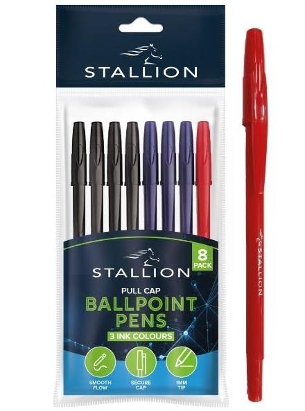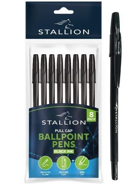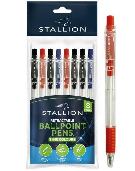 Stallion Colourful Retractable Ballpoint Pens - Black Ink - Pack of 8