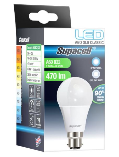 Supacell Led A60 Gls Es (E27) Base 5W Energy Saving Light Bulb With Screw Fitting - Cool White