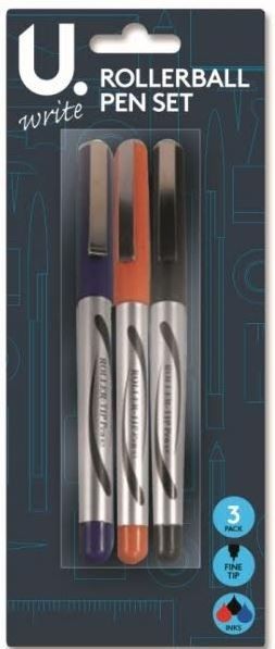U Write Fine Tip Roller Ball Pen Set - Assorted Colours - Pack of 3